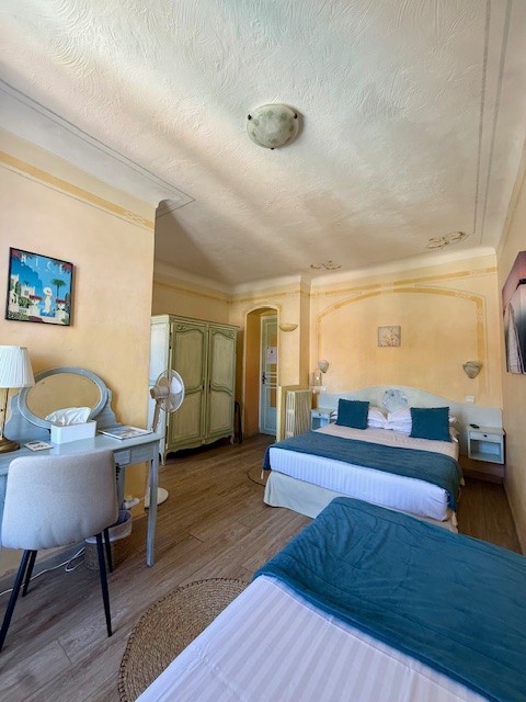 Idéale pour un séjour familial sur la Côte d’Azur, cette chambre spacieuse permet à chacun de profiter d’un espace personnel tout en partageant un même cadre agréable. La literie de qualité assure un repos optimal, tandis que la décoration douce et méditerranéenne apporte une sensation de bien-être immédiate.